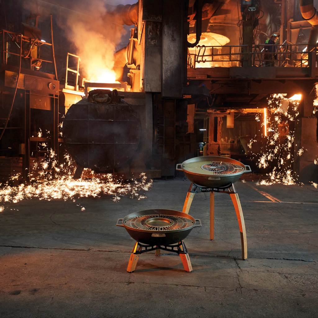 Liberamente mobile, consente alla legna o al carbone di mantenere una posizione orizzontale anche quando il braciere è inclinato. Le tre gambe in rovere locale oliato assicurano un appoggio sicuro. Le gambe in legno sono disponibili in due versioni: corte e